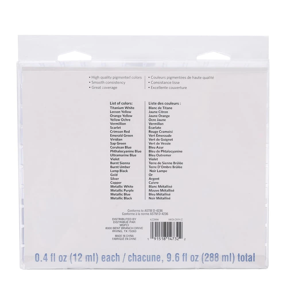 These beautiful oil paints will make a great addition to your art supplies. You can use these paints to create your own masterpiece on a wooden panel, canvas or any other surface. Pack colors include Titanium White, Lemon Yellow, Orange Yellow, Yellow Ochre, Vermillion, Scarlet, Crimson Red, Emerald Green, Viridian, Sap Green, Cerulean Blue, Phthalocyanine Blue, Ultramarine Blue, Violet, Burnt Sienna, Burnt Umber, Lamp Black, Gold, Silver, Copper, Metallic White, Metallic Purple, Metallic Blue, and Metallic Black.