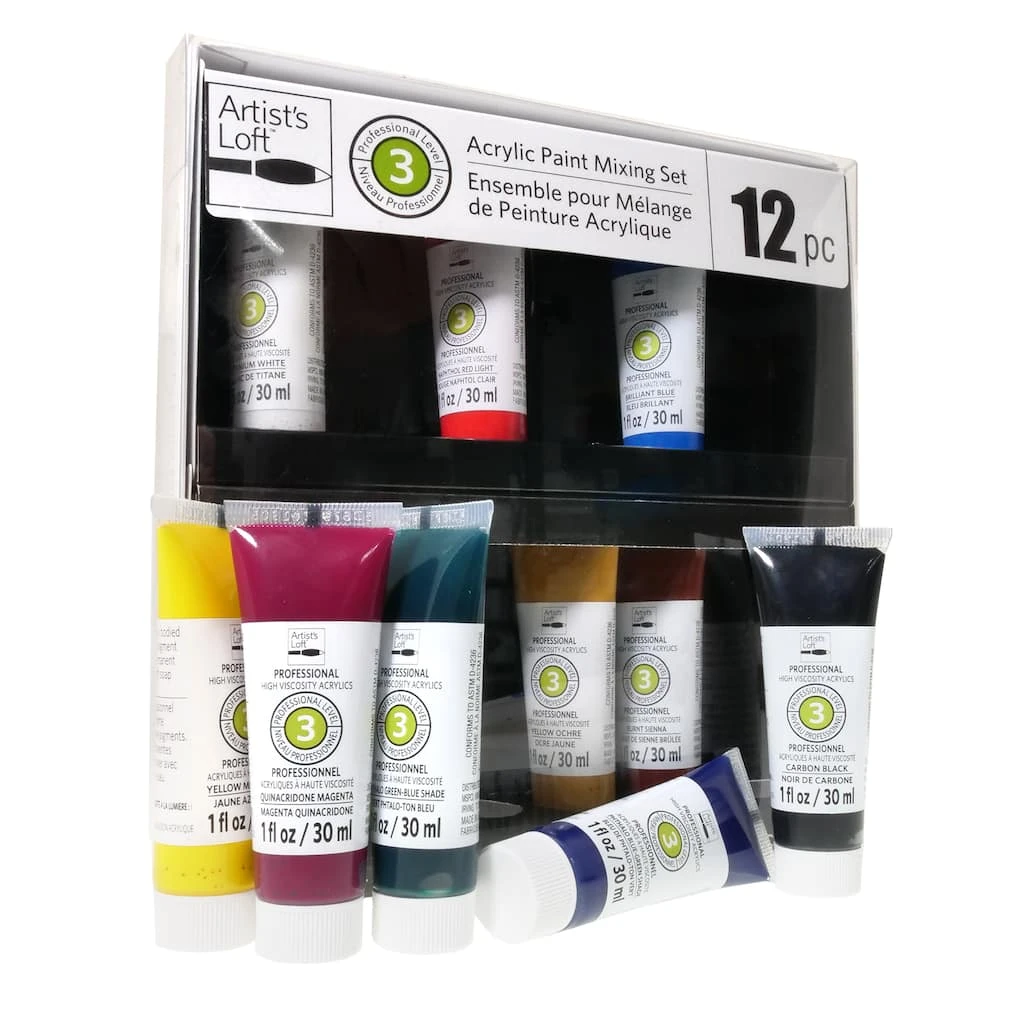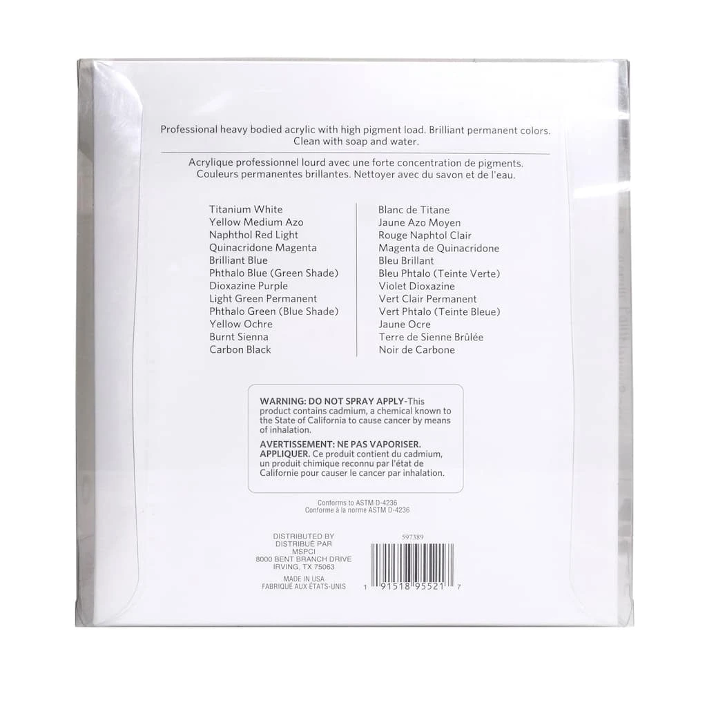 Stash this acrylic paint set in your art kit, and use it to add a pop of color to your drawings. The included paints will surely enhance your artwork. You can also use it to embellish unfinished, wooden plaques, storage crates and other DIY craft projects. Set colors include:Β Titanium White, Yellow Medium Azo, Naphthol Red Light, Quinacridone Magenta, Brilliant Blue, Phthalo Blue (Green Shade), Dioxazine Purple, Light Green Permanent, Phthalo Green (Blue Shade), Yellow Ochre, Burnt Sienna, and Carbon Black.