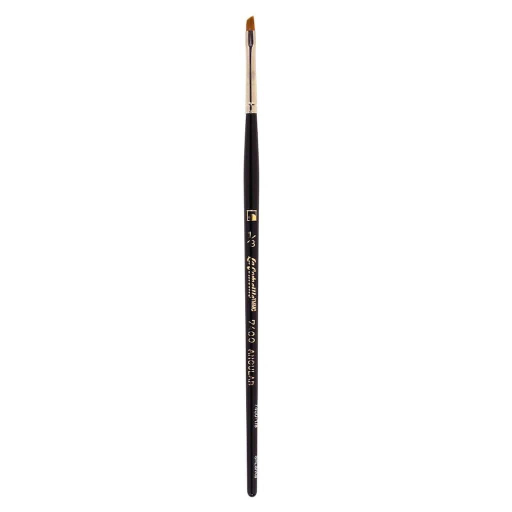 These golden Taklon brushes are widely-used for acrylic, oil, and watercolor decorative painting. This short handle angle shader brush is excellent for curved strokes, small corners, blending, shading, and reaching small areas. Designed for intermediate and advanced craft painters and fine artists, it has triple filament and fully dyed Taklon bristles, a seamless nickel-plated ferrule, and a lacquered wood handle. This brush is absorbent, durable, and versatile.