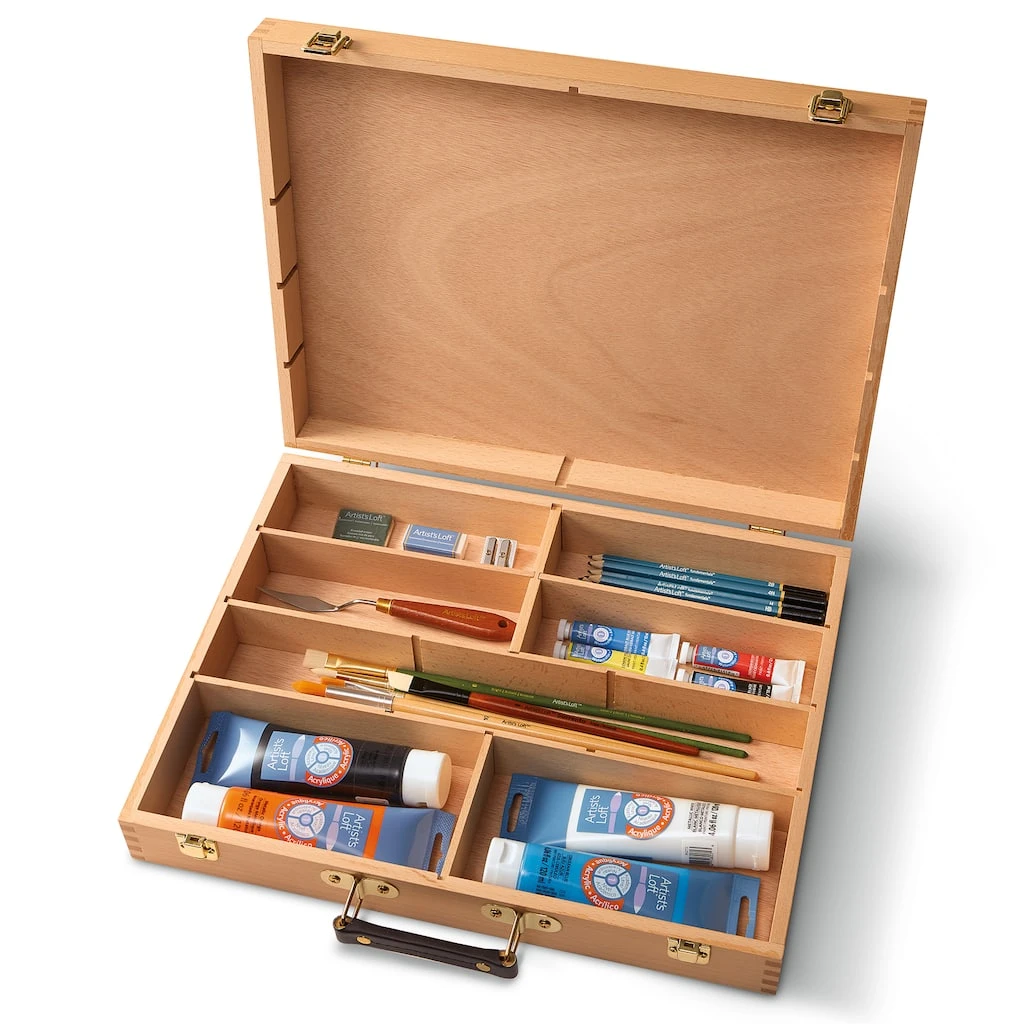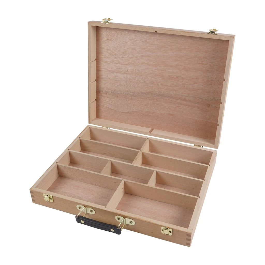 Store and organize your art supplies in the large art box. It features 8 repositionable dividers to customize the storage space to your art supplies needs. Store paints, brushes, art pencils and more with ease. The sleek solid wood box features a vegan leather handle that is perfect for on-the-go artists.